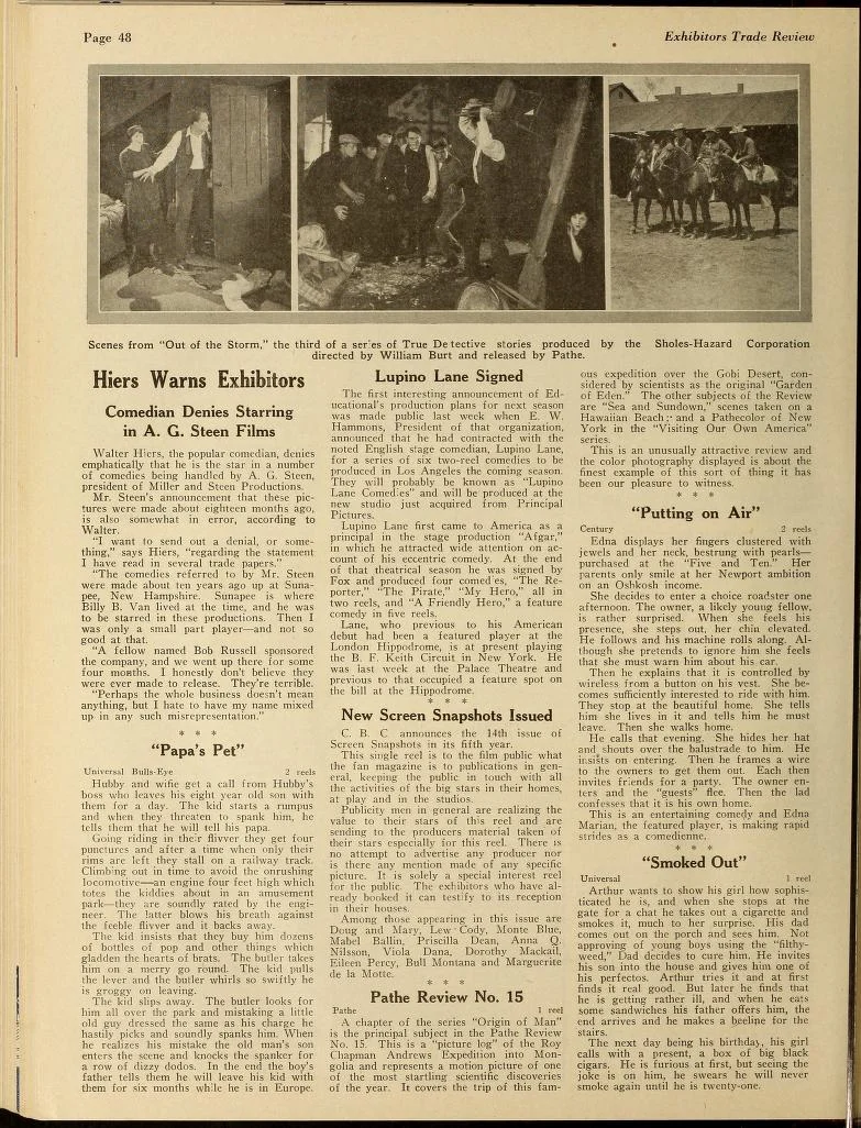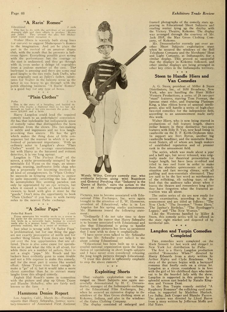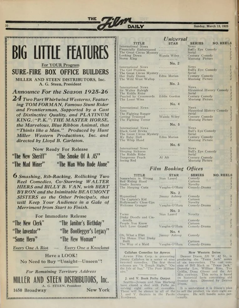 The Film Daily – March 15, 1925Billy B. Van/ Miller & Steen The Film Daily – March 15, 1925Billy B. Van, Miller & Steen, Film titles: “The New Clerk,” “The Inventor,” “Some Hero,”“The Janitor’s Birthday,” “The Bootlegger’s Legacy,” “The New Woman” Exhibitors Trade Review – March 28, 1925Billy B. Van, Miller & Steen, Films: “The New Clerk,” “The Inventor,” “Some Hero,” “The Janitor’s Birthday,” “The Bootlegger’s Legacy,” “The New Woman” Exhibitors Trade Review – April 11, 1925Walter Hiers denies being in Billy B. Van movies/A.G. Steen, Miller & Steen