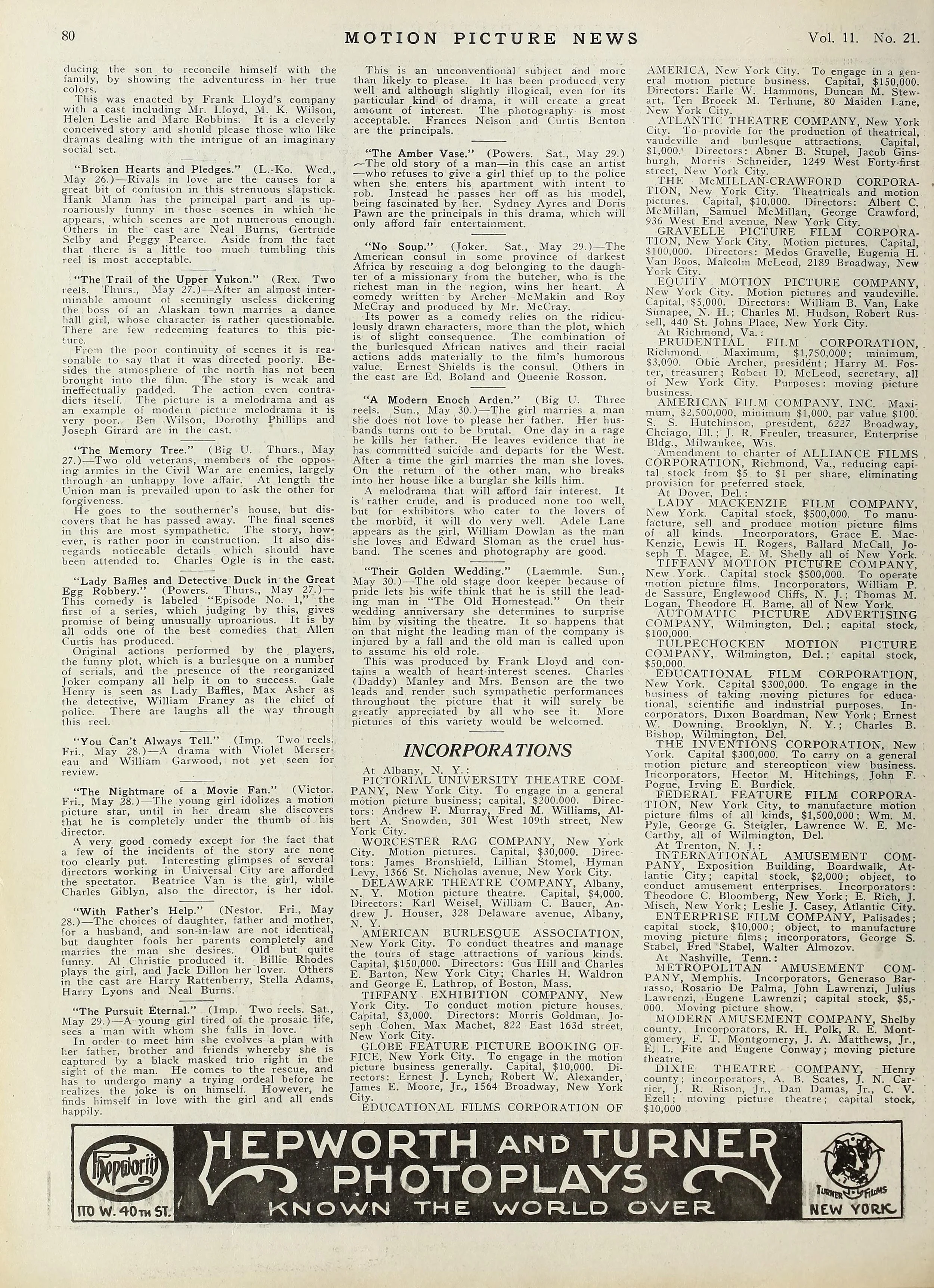 Motion pictures and vaudeville. Capital, $5,000. Directors: William B. Van, Lake Sunapee, N. H. ; Charles M. Hudson, Robert Russell, 440 St. Johns Place, New York City.Source Files