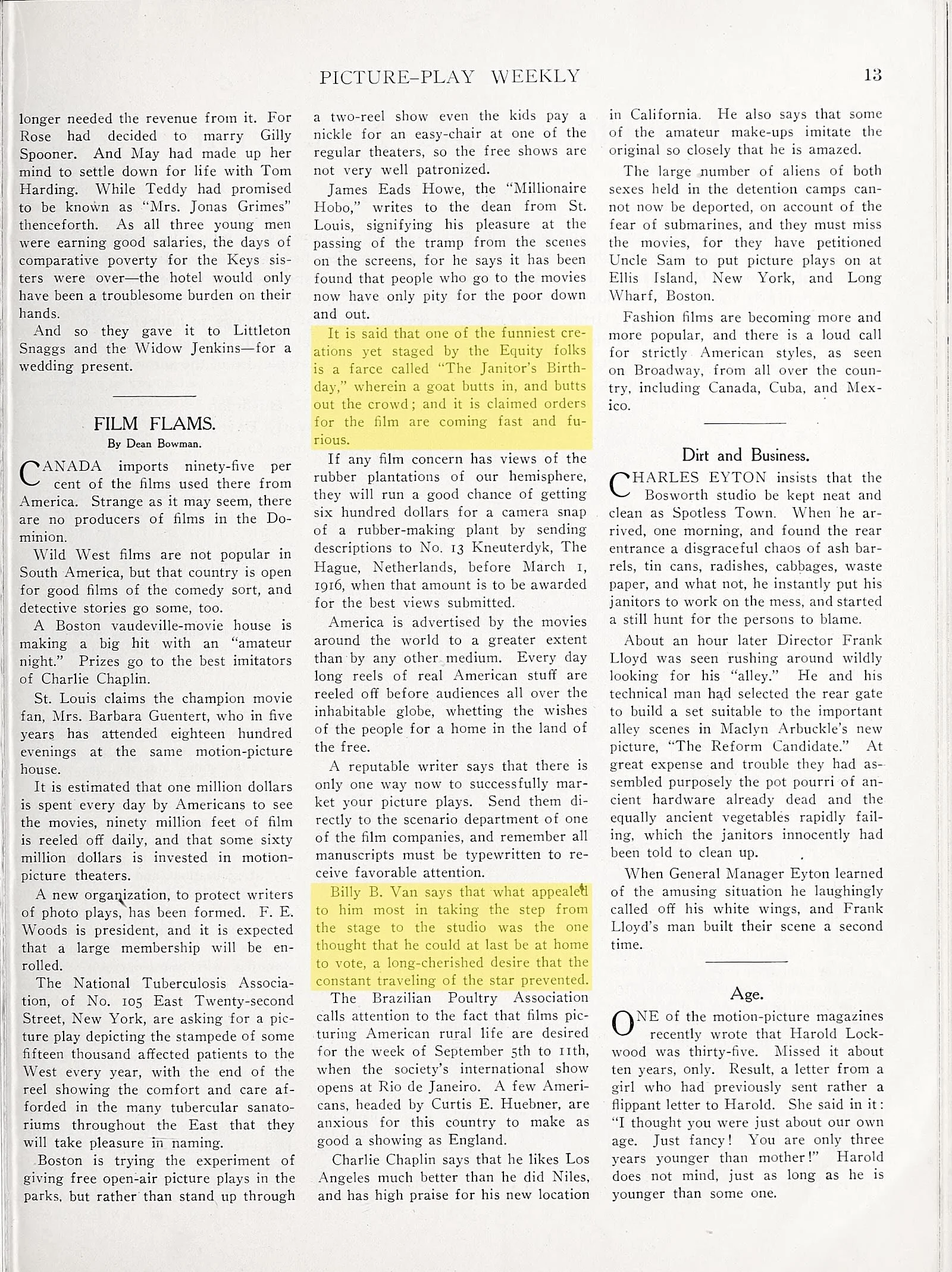 Briefly reports that Billy B. Van’s comedy The Janitor’s Birthday is attracting strong exhibitor interest, with an additional note on Van’s move from stage to motion pictures.
