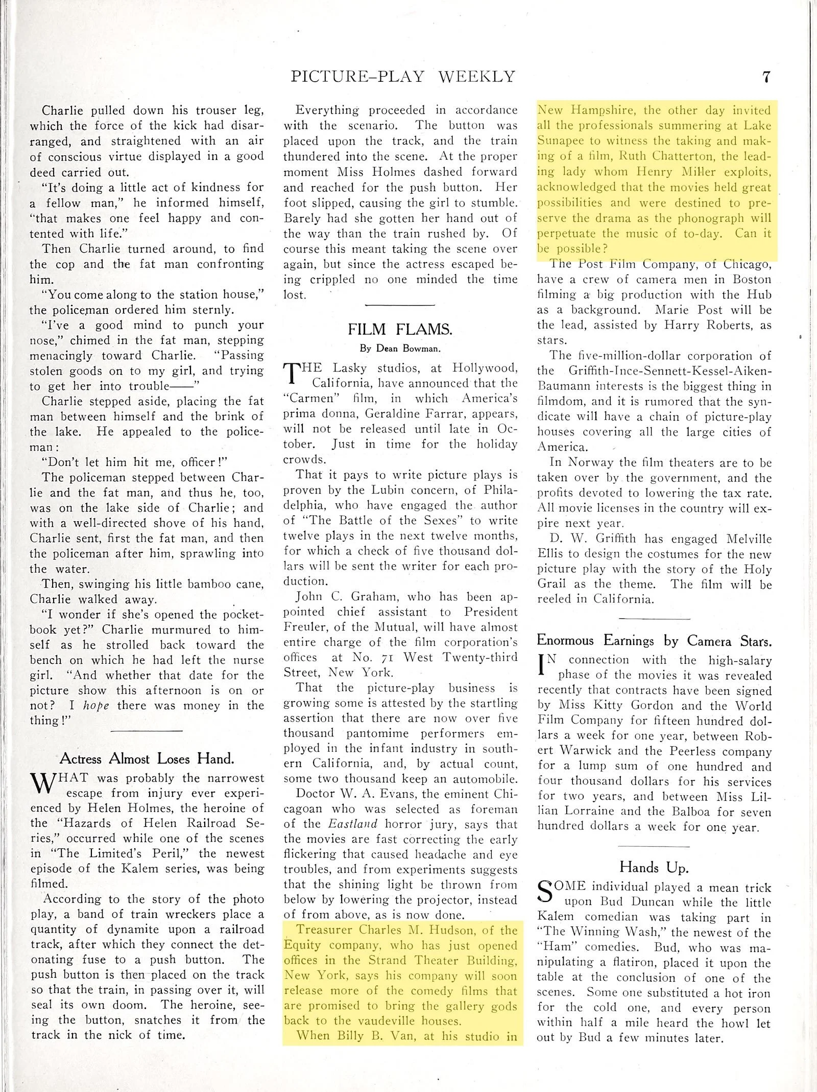 When Billy B. Van, at his studio in New Hampshire, the other day invited all the professionals summering at Lake Sunapee to witness the taking and making of a film, Ruth Chatterton, the leading lady whom Henry Miller exploits, acknowledged that the movies held great possibilities and were destined to preserve the drama as the phonograph will perpetuate the music of to-day. Can it be possible?Source Files
