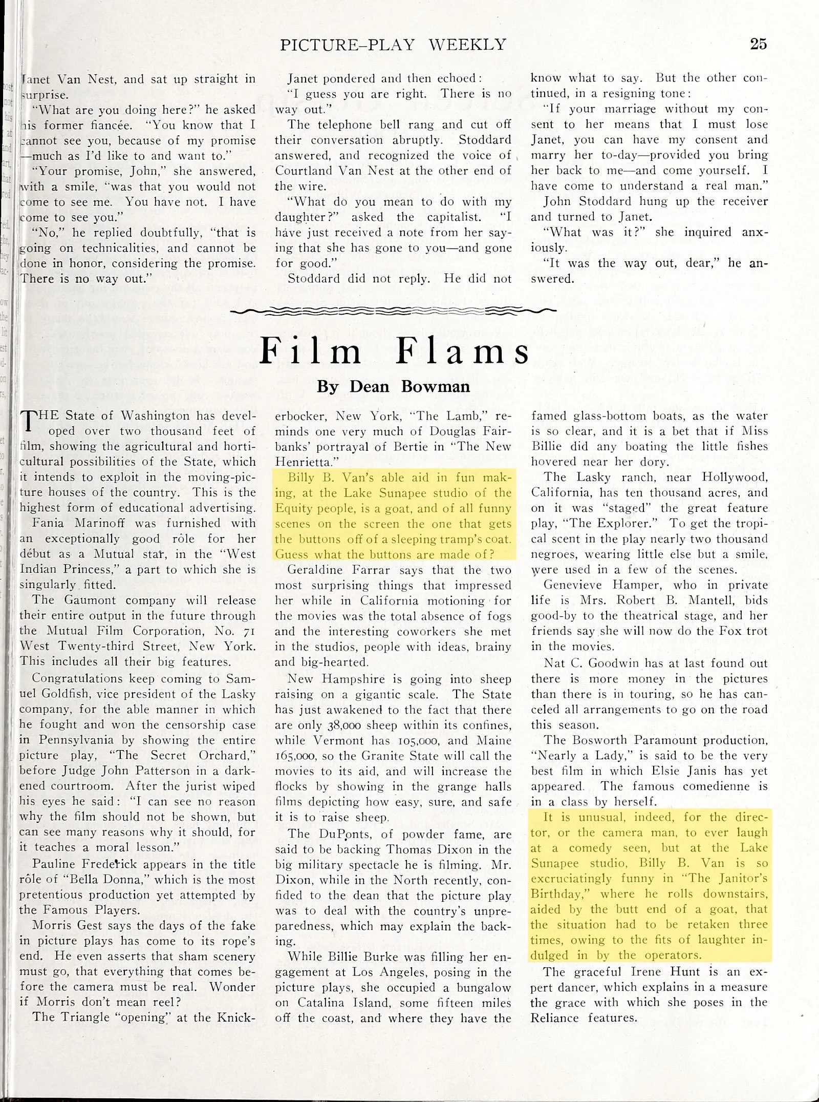 It is unusual, indeed, for the director, or the camera man, to ever laugh at a comedy seen, but at the Lake Sunapee studio, Billy B. Van is so excruciatingly funny in ”The Janitor’s Birthday,” where he rolls downstairs, aided by the butt end of a goat, that the situation had to be retaken three times, owing to the fits of laughter indulged in by the operators.