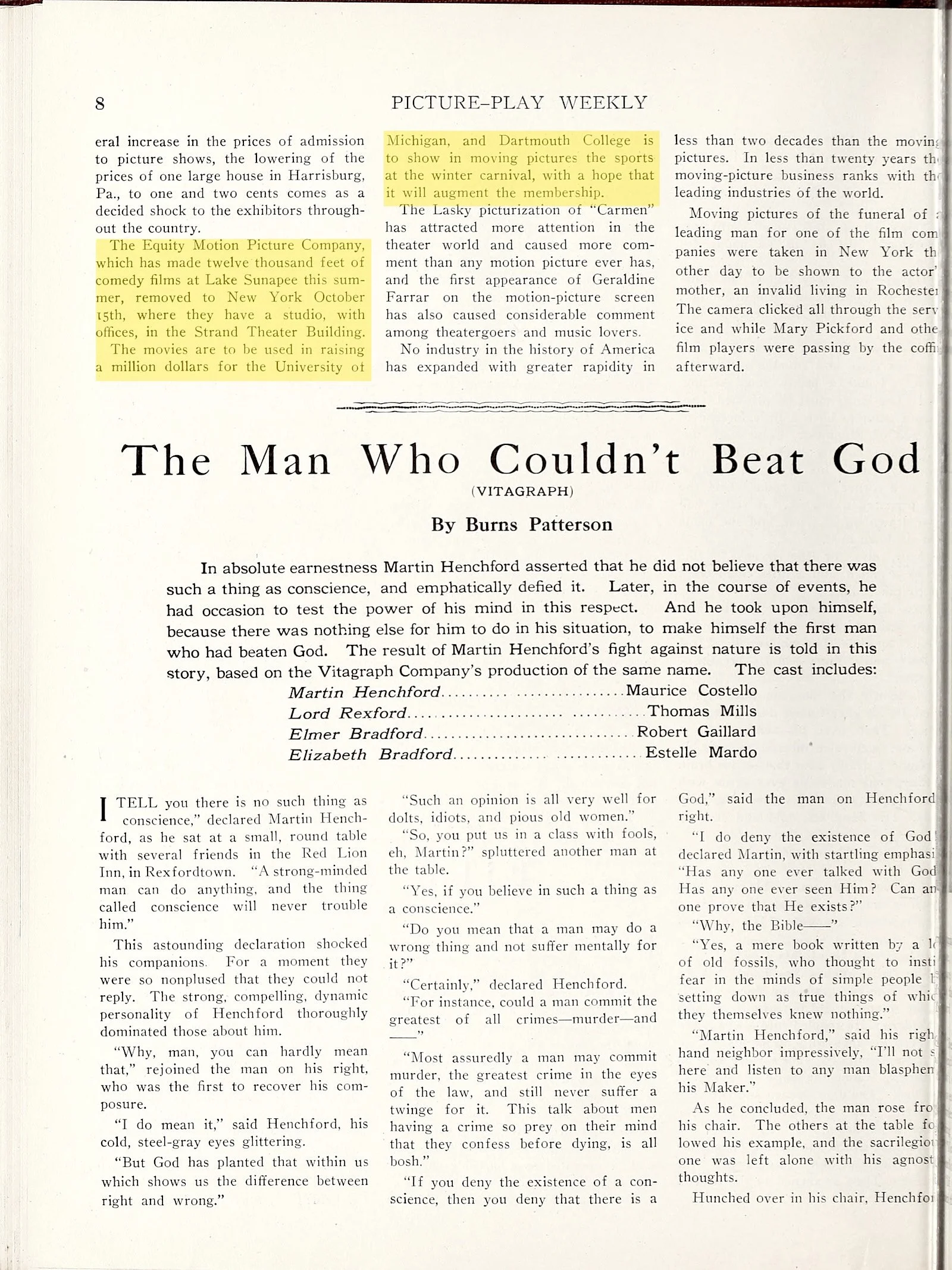 Equity Motion Picture Company completes filming at Lake Sunapee and moves production to the Strand Theater in New York City. Films to be used to raise one million dollars for the University of Michigan and Dartmouth College.