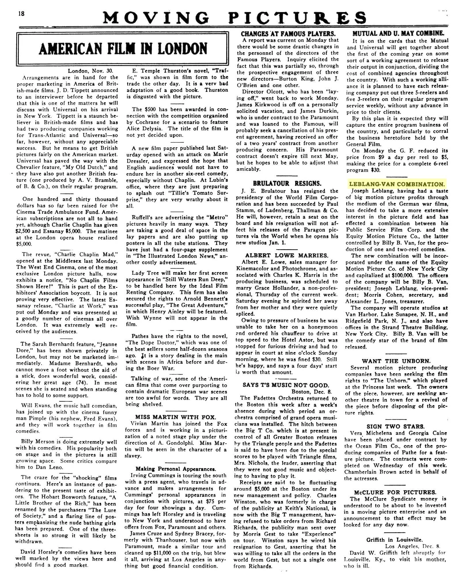 Joseph Leblang, having had a taste of big motion picture profits through the medium of the German war films, has decided to take a more extensive interest in the picture field and has effected a combination between his Public Service Film Corp. and the Equity Motion Picture Co., the latter controlled by Billy B. Van, for the production of one and two-reel comedies. The new combination will be incorporated under the name of the Equity Motion Picture Co. of New York City and capitalized at $100,000. The officers of the company will be Billy B. Van, president; Joseph Leblang, vice-president; Morris Cohen, secretary, and Alexander L. Jones, treasurer. The company will operate studios at Van Harbor, Lake Sunapee, N. H., and Ridgefield Park, N. J., and also have offices in the Strand Theatre Building, New York City. Billy B. Van will be the comedy star of the brand of film released.Source Files