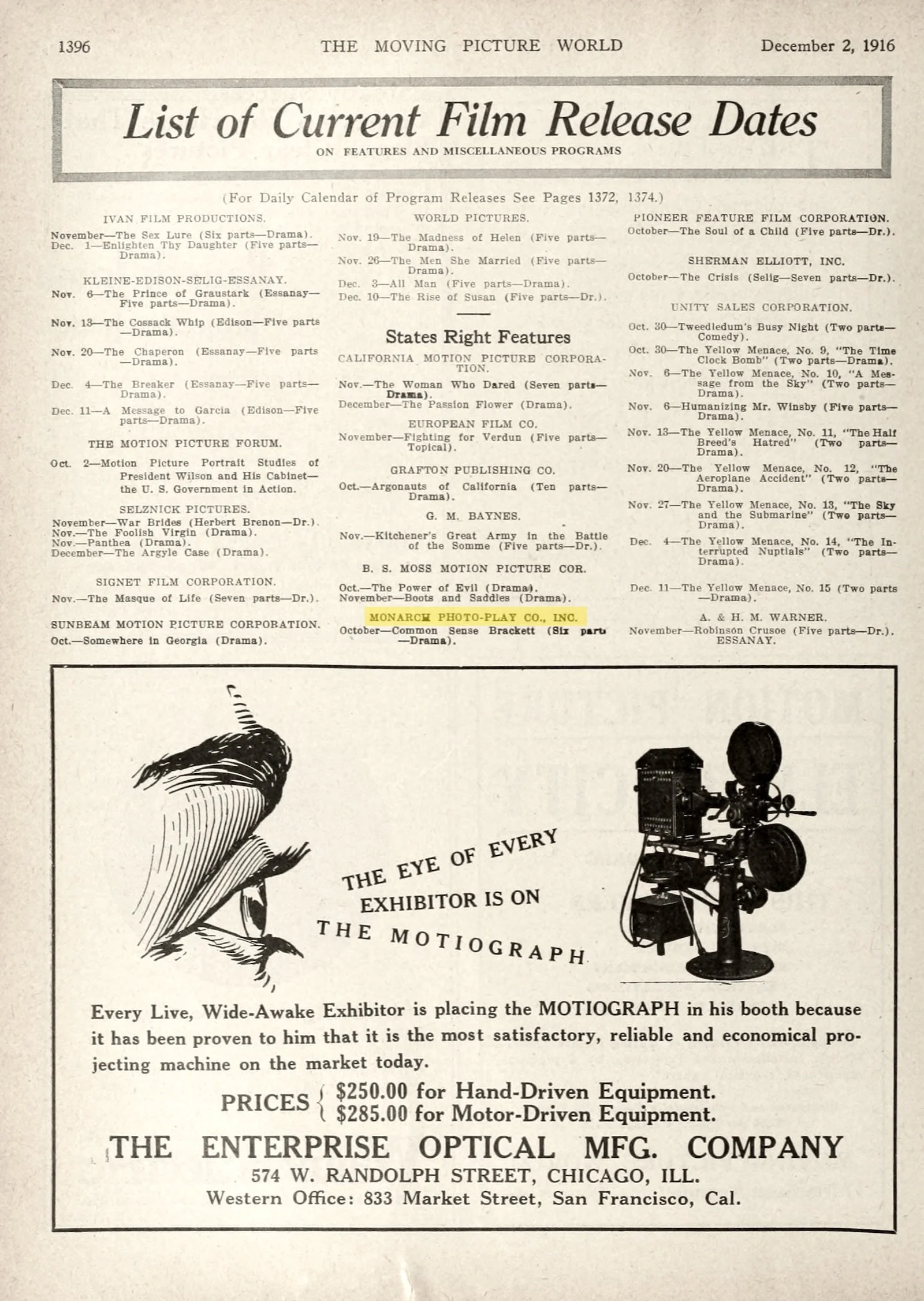 Release date for Monarch Photoplay's Common Sense Brackett