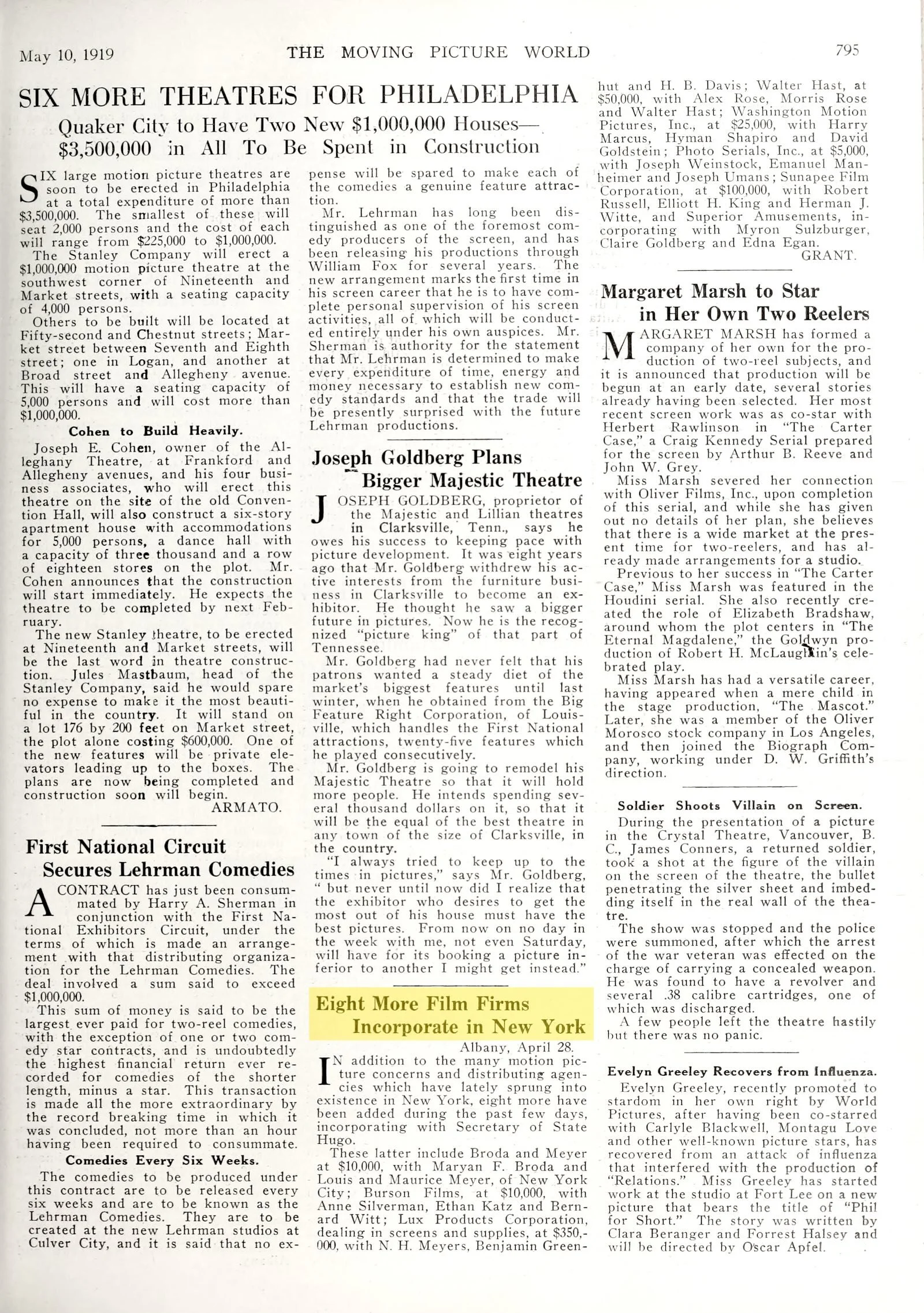 Albany, April 28. IN addition to the many motion picture concerns and distributing agencies which have lately sprung into existence in New York, eight more have been added during the past few days, incorporating with Secretary of State Hugo. These latter include Broda and Meyer at $10,000, with Maryan F. Broda and Louis and Maurice Meyer, of New York City; Burson Films, at $10,000, with Anne Silverman, Ethan Katz and Bernard Witt; Lux Products Corporation, dealing in screens and supplies, at $350,000, with N. H. Meyers, Benjamin Greenhut and H. B. Davis; Walter Hast, at $50,000, with Alex Rose, Morris Rose and Walter Hast; Washington Motion Pictures, Inc., at $25,000, with Harry Marcus, Hyman Shapiro and David Goldstein; Photo Serials, Inc., at $5,000, with Joseph Weinstock, Emanuel Manheimer and Joseph Umans; Sunapee Film Corporation, at $100,000, with Robert Russell, Elliott H. King and Herman J. Witte, and Superior Amusements, incorporating with Myron Sulzburger, Claire Goldberg and Edna Egan.