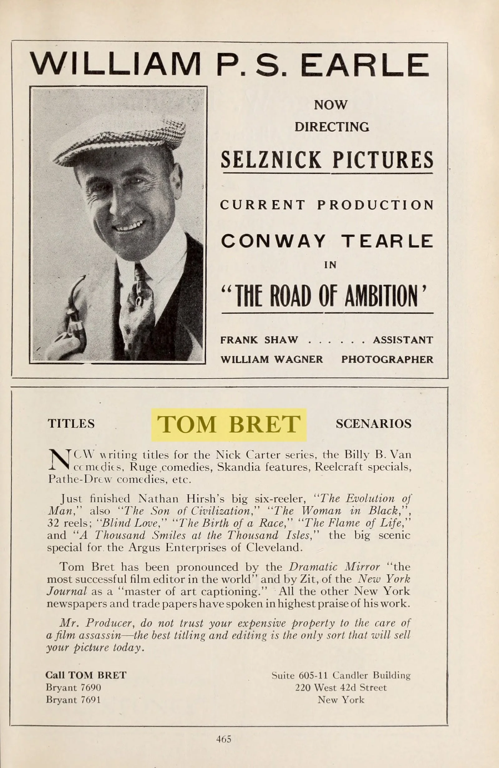 Tom Bret has been pronounced by the Dramatic Mirror ”the most successful film editor in the world” and by Zit, of the New York Journal as a ”master of art captioning.” All the other New York newspapers and trade papers have spoken in highest praise of his work.