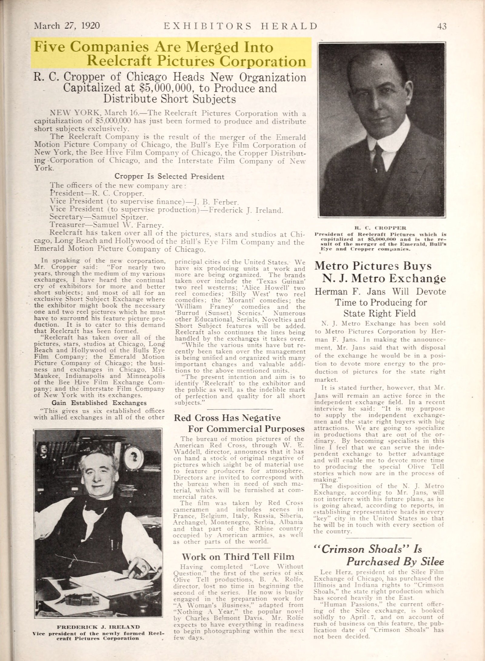 Reelcraft Pictures formed with $5,000,000 capitalization, and merger of the Emerald Motion Picture Company, Bulls Eye Film Corporation, Bee Hive Film Company, Cropper Distributing Corporation and the Interstate Film Company.