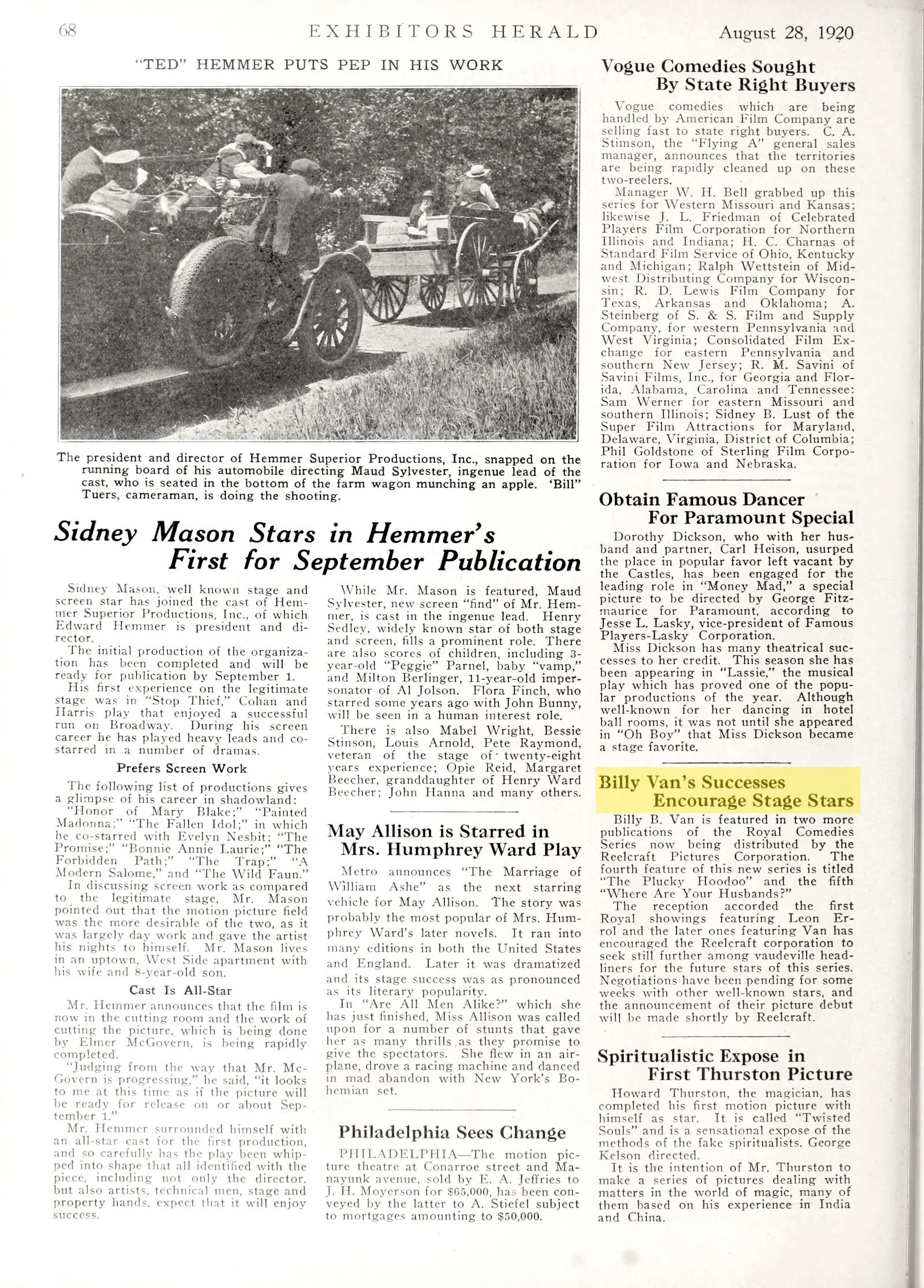 Billy B. Van is featured in two more publications of the Royal Comedies Series now being distributed by the Reelcraft Pictures Corporation. The fourth feature of this new series is titled "The Plucky Hoodoo" and the fifth "Where Are Your Husbands?"