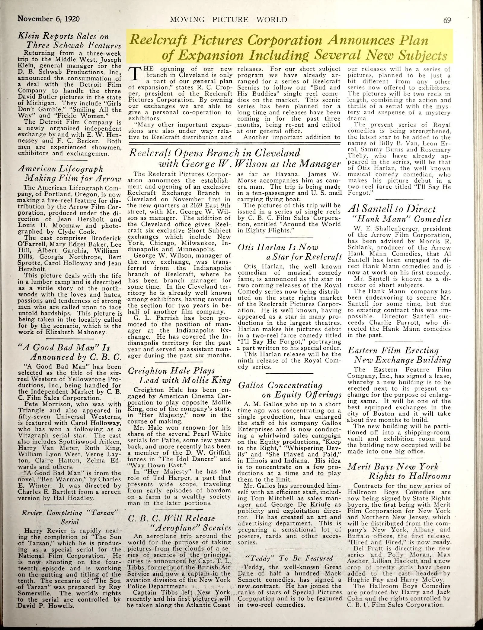 “Many other important expansions are also under way relative to Reelcraft distribution and releases. For our short subject program we have already arranged for a series of Reelcraft Scenics to follow our ”Bud and His Buddies” single reel comedies on the market. This scenic series has been planned for a long time and releases have been coming in for the past three months, being re-cut and edited at our general office. Another important addition to our releases will be a series of pictures, planned to be just a bit different from any other series now offered to exhibitors. The pictures will be two reels in length, combining the action and thrills of a serial with the mystery and suspense of a mystery drama.