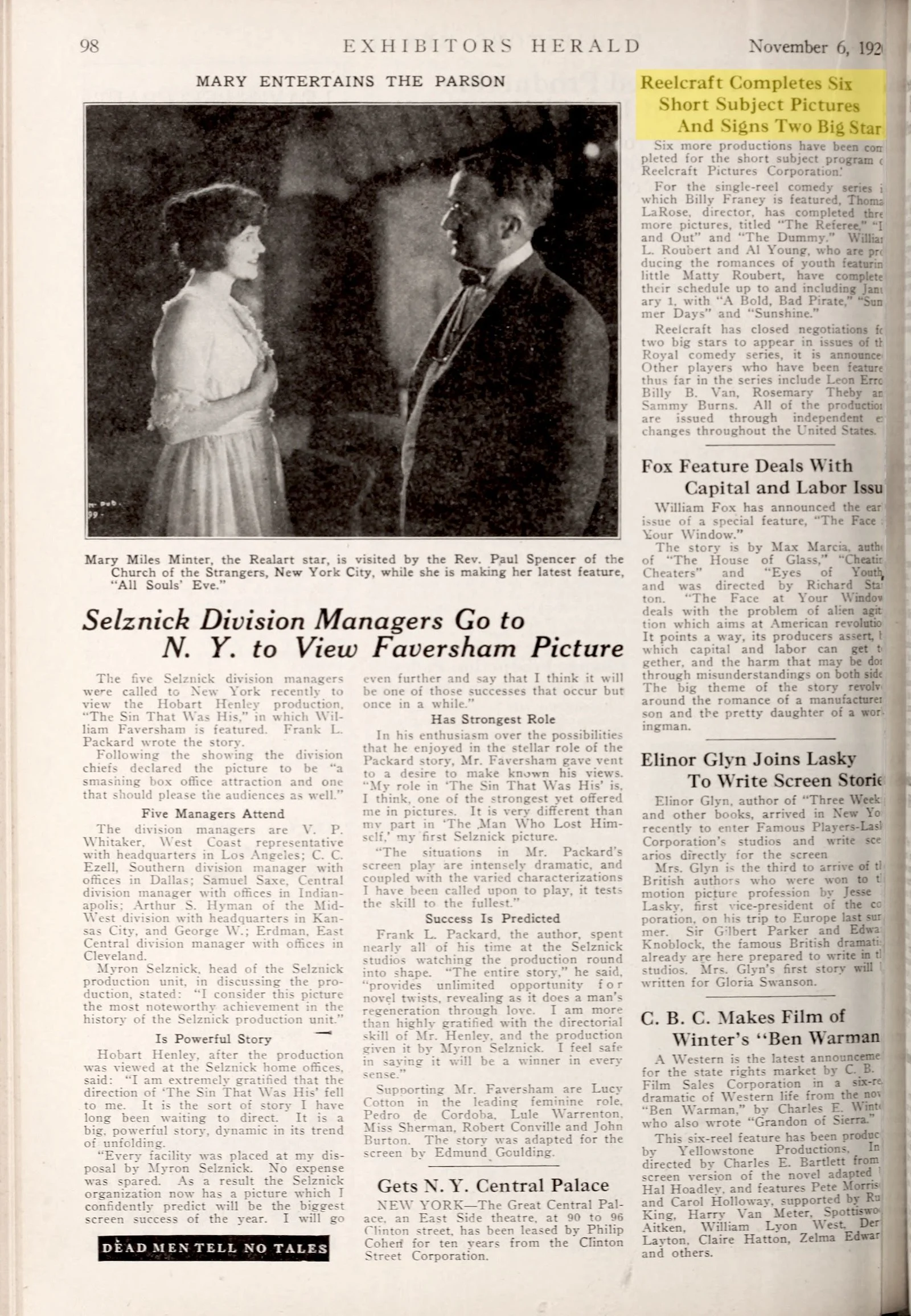 Six more productions have been completed for the short subject program of Reelcraft Pictures Corporation. For the single-reel comedy series in which Billy Franey is featured, Thomas LaRose, director, has completed three more pictures, titled ”The Referee,” ”In and Out” and ”The Dummy.” William L. Roubert and Al Young, who are producing the romances of youth featuring little Matty Roubert, have complete their schedule up to and including January 1, with ”A Bold, Bad Pirate,” ”Summer Days” and ”Sunshine.” Reelcraft has closed negotiations for two big stars to appear in issues of the Royal comedy series, it is announced. Other players who have been featured thus far in the series include Leon Errol, Billy B. Van, Rosemary Theby and Sammy Burns. All of the productions are issued through independent exchanges throughout the United States.