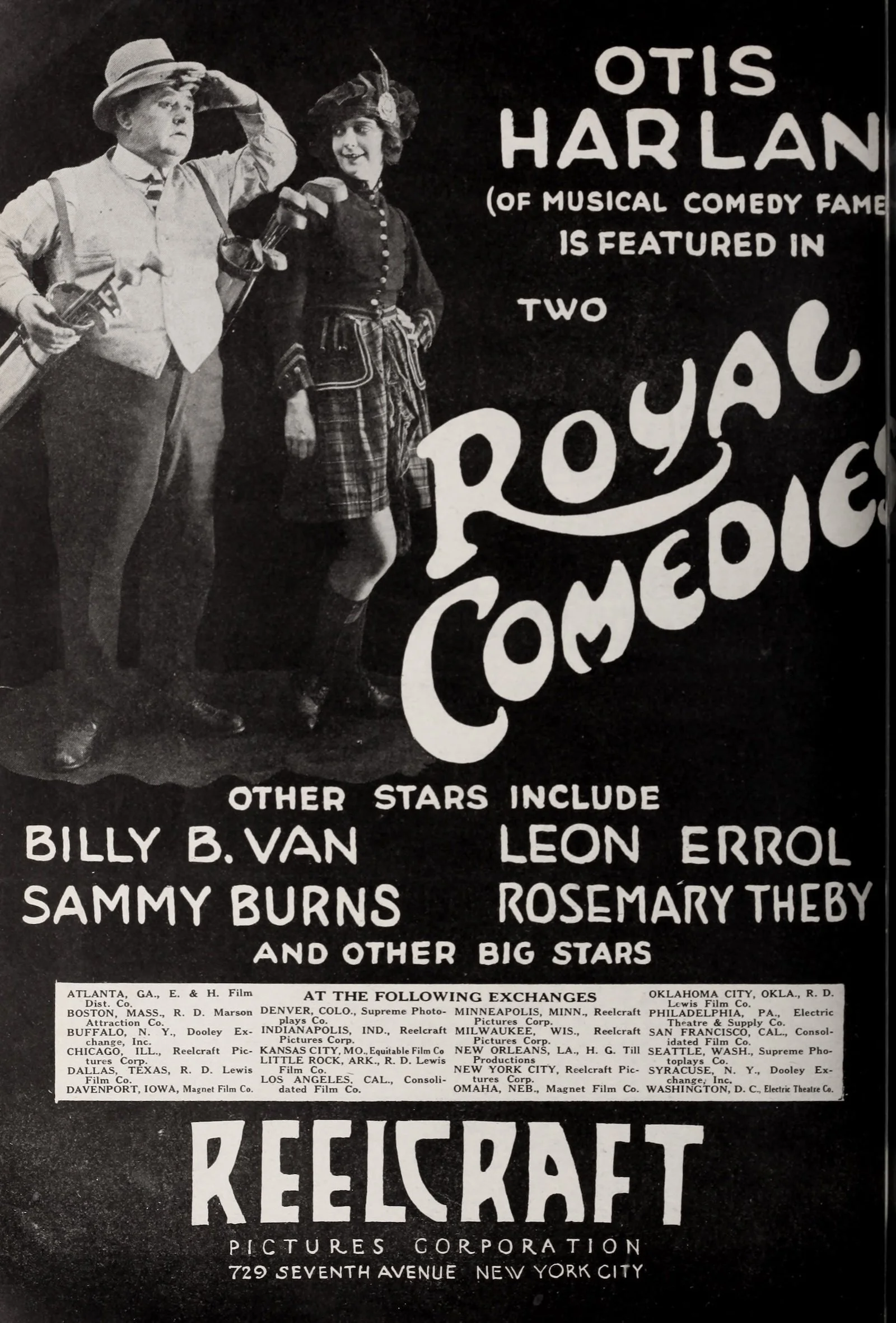 Advertisement for Reelcraft Royal Comedy series, with Billy B. Van listed as one of the stars. Includes locations of Reelcraft Pictures exchanges.