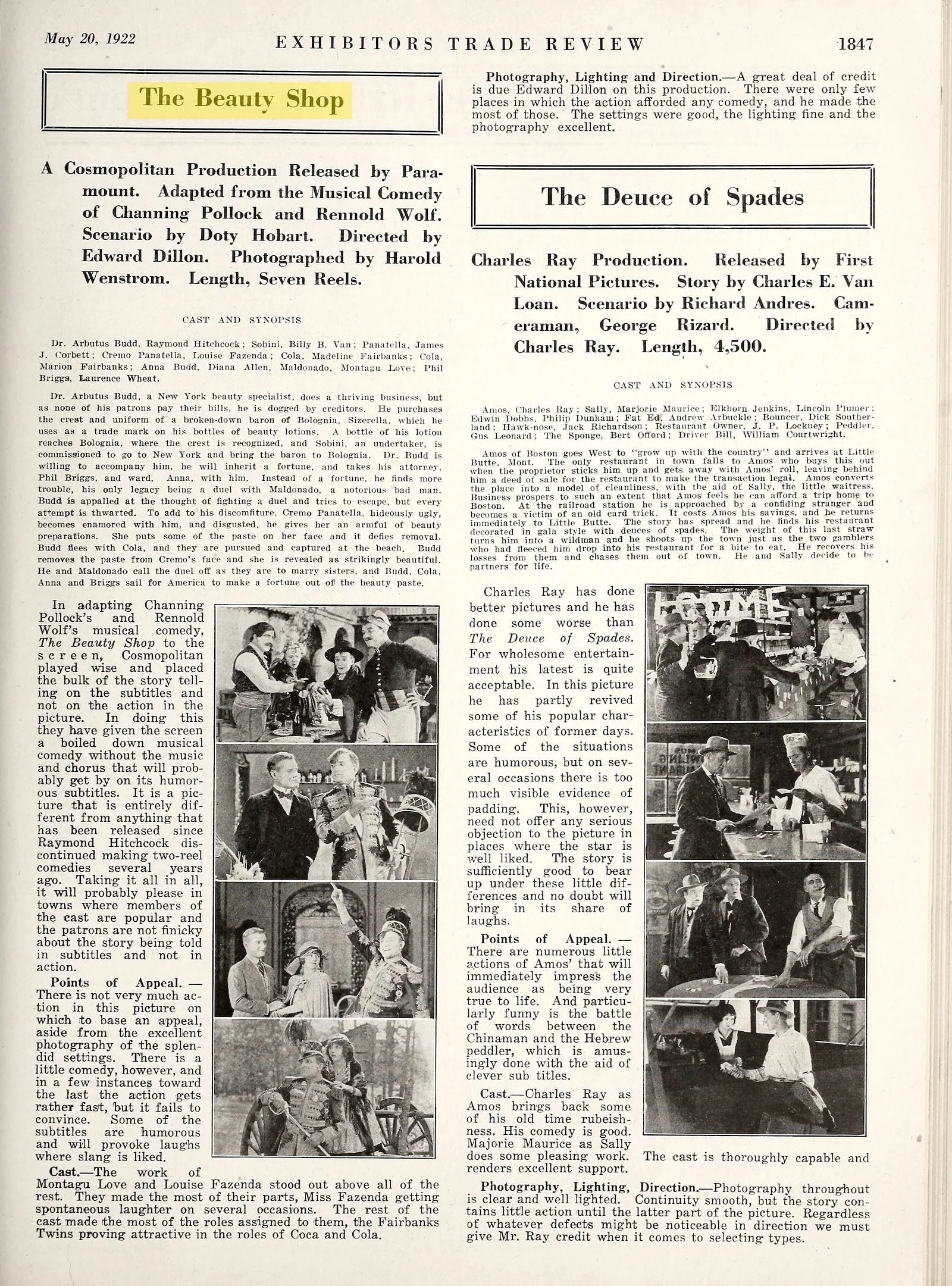 In adapting Channing Pollock's and Rennold Wolf's musical comedy. The Beauty Shop to the screen, Cosmopolitan played wise and placed the bulk of the story telling on the subtitles and not on the action in the picture. In doing this they have given the screen a boiled down musical comedy without the music and chorus that will probably get by on its humorous subtitles. It is a picture that is entirely different from anything that has been released since Raymond Hitchcock discontinued making two-reel comedies several years ago. Taking it all in all, it will probably please in towns where members of the cast are popular and the patrons are not finicky about the story being told in subtitles and not in action.