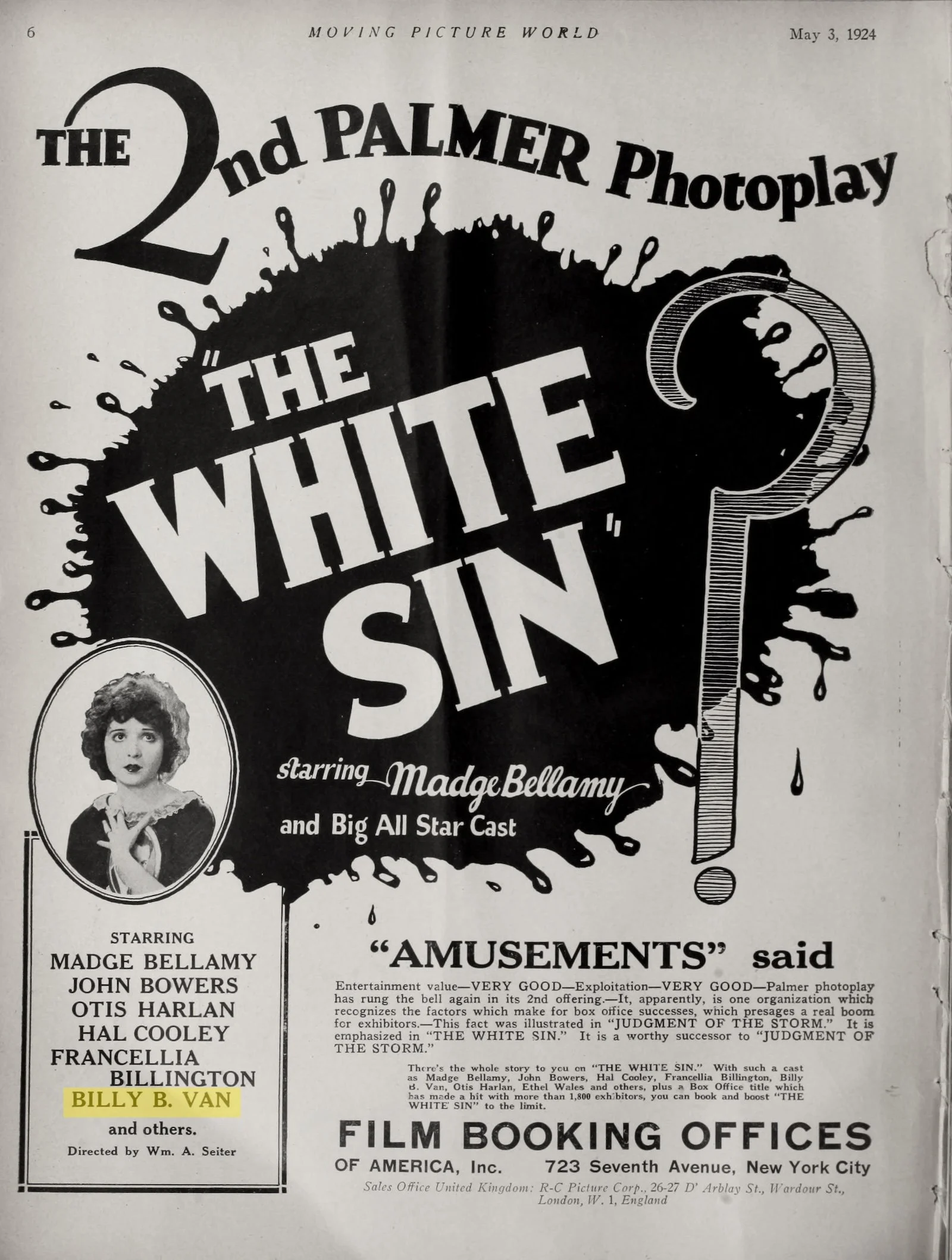 Advertisement for "White Sin" Mistakenly Lists Billy B. Van in Cast