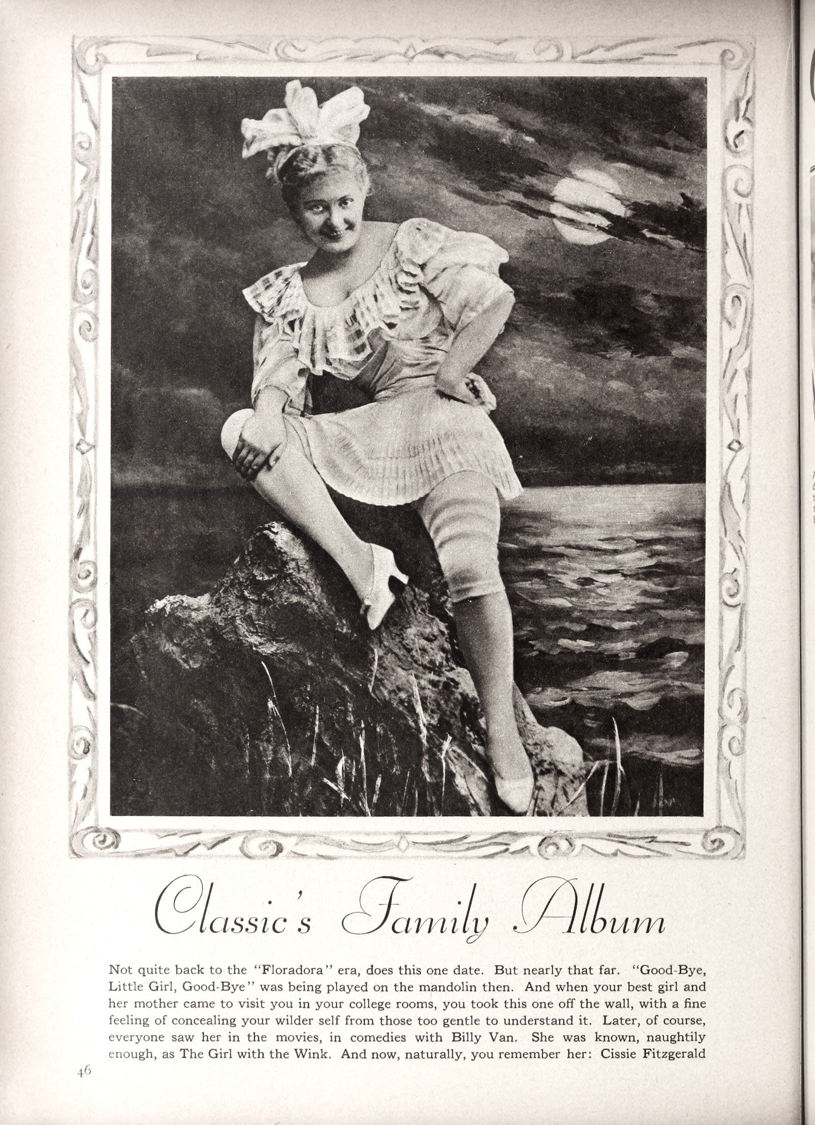Not quite back to the ”Floradora” era, does this one date. But nearly that far. ”Good-Bye, Little Girl, Good-Bye” was being played on the mandolin then. And when your best girl and her mother came to visit you in your college rooms, you took this one off the wall, with a fine feeling of concealing your wilder self from those too gentle to understand it. Later, of course, everyone saw her in the movies, in comedies with Billy Van. She was known, naughtily enough, as The Girl with the Wink. And now, naturally, you remember her: Cissie Fitzgerald.